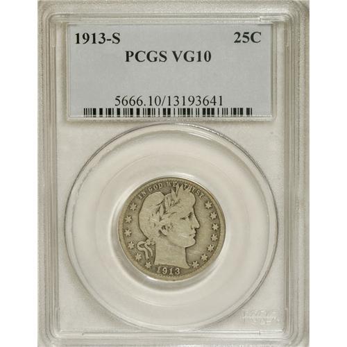 <B>1913-S 25C VG10 PCGS.</B></I> The 1913-S is one of the three keys to the Barber quarter series, and has its lowest mintage (40,000 business strikes). The Choice VG example presented in this lot will fit ideally in a low to mid-grade Barber quarter collection. Slightly darker gray-blue fields highlight somewhat the design features, especially on the reverse. Each side portrays good detail for the grade: most of the leaves on the obverse wreath show, as do the letters LI and Y in LIBERTY (the T partially shows). On the reverse, most of the motto letters are clear, and there is some detail left in the eagle's wings, legs, and shield. Full rims exhibit relatively strong dentilation on the reverse. Wispy circulation marks on the obverse portrait are mentioned for complete accuracy.<BR><BR><b>Shipping:</b> Coins & Currency (<a target="_blank" href="http://www.heritageauctions.com/common/shipping.php">view shipping information</a>)