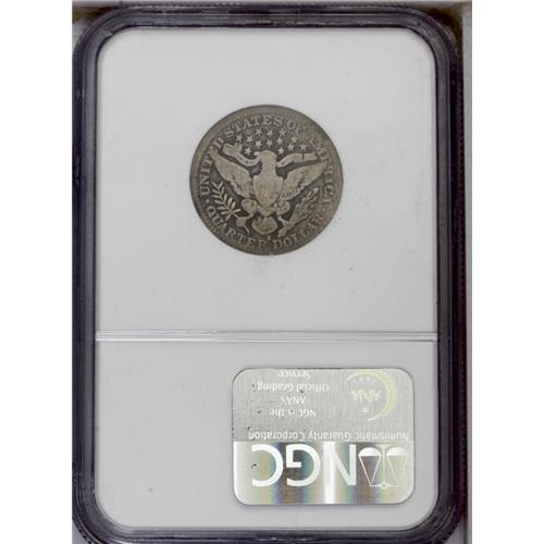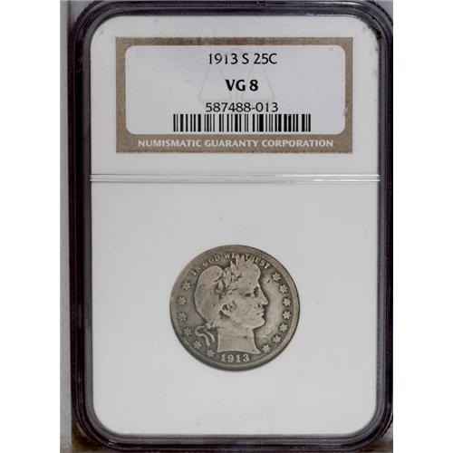 <B>1913-S<25C> VG8 NGC.</B></I> The '13-S is one of the big three issues in the Barber quarter series, with a mintage of a mere 40,000 coins. Well worn as expected, this piece displays slightly uneven light to dark-gray toning. There are no major distracting marks in the fields despite the degree of wear.