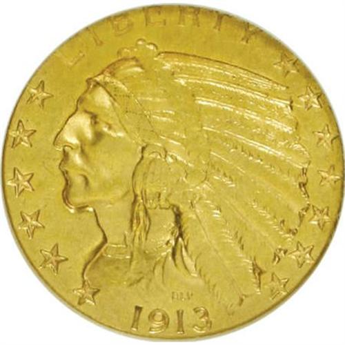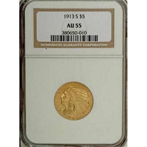 <B>1913-S $5 AU55 NGC.</B></I> . NGC Census: (208/704). PCGS Population (91/333). Mintage: 408,000. Numismedia Wsl. Price for NGC/PCGS coin in AU55: $475. (#8526)<BR><BR><B>Coin Engraver:</B> Bela Lyon Pratt<BR><BR><b>Shipping:</b> Coins & Currency (<a target="_blank" href="http://www.heritageauctions.com/common/shipping.php">view shipping information</a>)