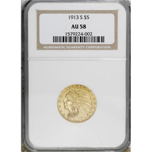 <B>1913-S $5 AU58 NGC.</B></I> NGC Census: (426/262). PCGS Population (95/233). Mintage: 408,000. Numismedia Wsl. Price for NGC/PCGS coin in AU58: $685. (#8526)<BR><BR><B>Coin Engraver:</B> Bela Lyon Pratt<BR><BR><b>Shipping:</b> Coins & Currency (<a target="_blank" href="http://www.heritageauctions.com/common/shipping.php">view shipping information</a>)