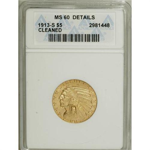 <B>1913-S $5 --Cleaned--ANACS. MS60 Details.</B></I> NGC Census: (28/226). PCGS Population (4/211). Mintage: 408,000. Numismedia Wsl. Price for NGC/PCGS coin in MS60: $1,175. (#8526)<BR><BR><b>Shipping:</b> Coins & Currency (<a target="_blank" href="http://www.heritageauctions.com/common/shipping.php">view shipping information</a>)