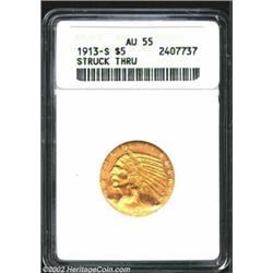 1913-S $5 Half Eagle--Struck Through--ANACS. All errors are rare on U.S. gold coins, but to find one on a conditionally challenging issue such as the 1913-S Indian Five is of even more import to specialists. The copper-gold features are minimally worn and partially lustrous with no singularly distracting abrasions. There is a sizeable strike through on the obverse that has resulted in distorted definition over the Indian's portrait directly above the date. Important notice: We expect to be auctioning lots at the rate of 200-250 per hour. Sometimes eBay Premier live bid software cannot keep up with that pace, so we strongly recommend that you place a realistic proxy bid now as insurance to avoid disappointment. Also please note that all Heritage/CAA lots purchased through eBay Premier carry a 20% Buyer's Premium. Please make sure you read the Terms and Conditions.