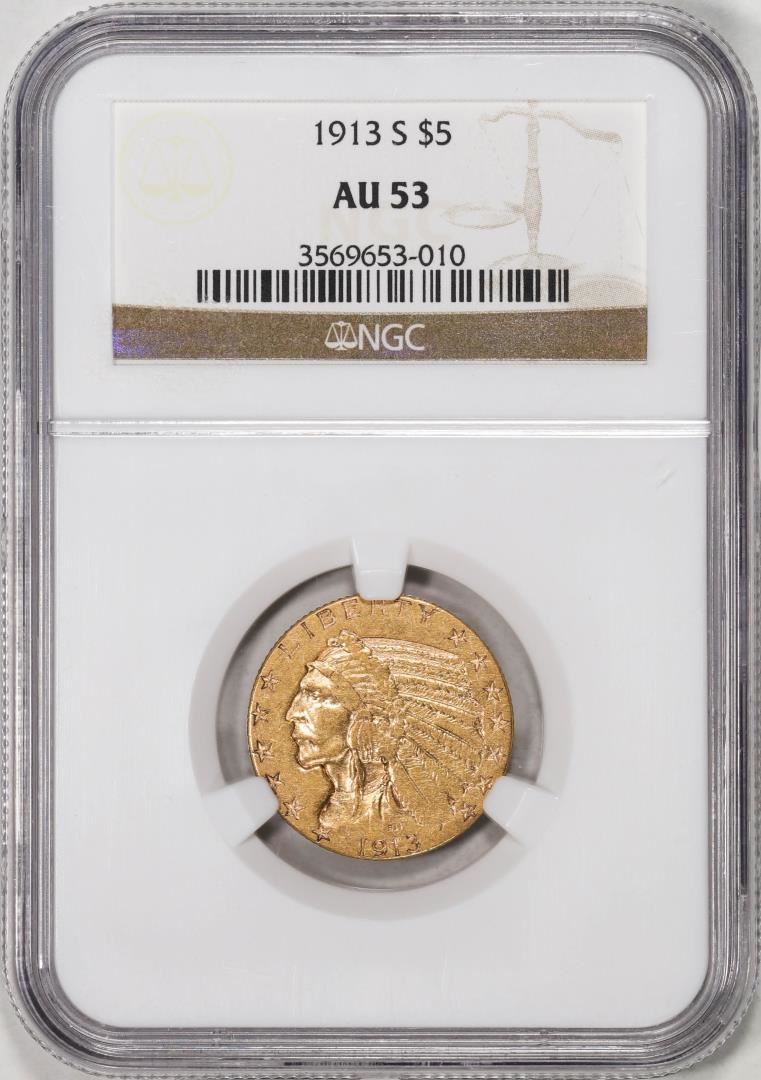 One 1913-S $5 Indian Head Half Eagle Gold Coin NGC AU53. NGC Certified.