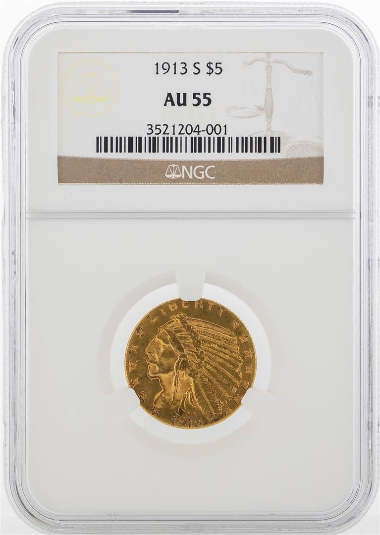 One 1913-S $5 Indian Head Half Eagle Gold Coin NGC AU55. NGC Certified.