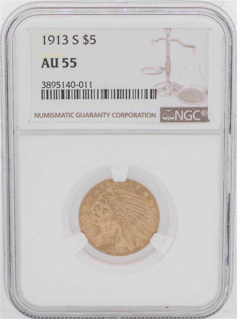One 1913-S $5 Indian Head Half Eagle Gold Coin NGC AU55. NGC Certified.