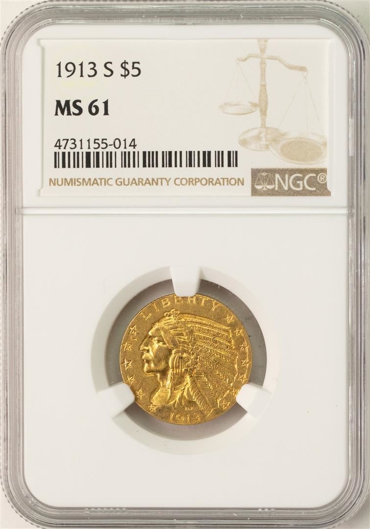 One 1913-S $5 Indian Head Half Eagle Gold Coin NGC MS61. NGC Certified.