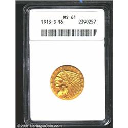 1913-S $5 MS61 ANACS.<p>Deeply lustrous with rich golden coloration and predictable mushiness at the borders. One of the scarcest of the Five Dollar Indian issues in Uncirculated grades.From the Ric Leichtung Collection. Important notice: We expect to be auctioning lots at the rate of 200-250 per hour. Sometimes eBay Premier live bid software cannot keep up with that pace, so we strongly recommend that you place a realistic proxy bid now as insurance to avoid disappointment. Also please note that all Heritage/CAA lots purchased through eBay Premier carry a 20% Buyer's Premium.