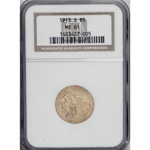 1913-S $5 MS61 NGC. A softly lustrous honey-gold piece