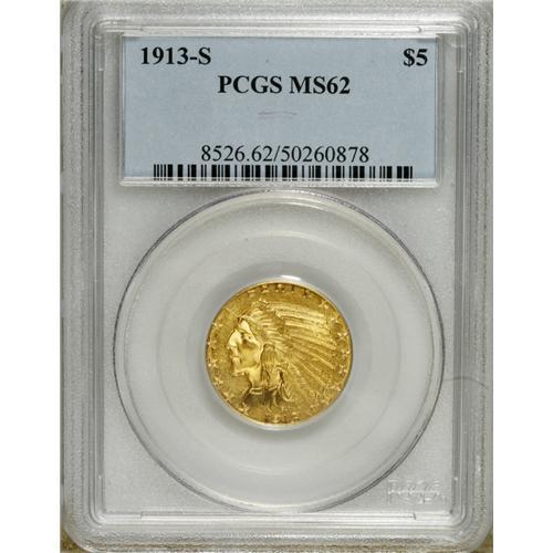 1913-S $5 MS62 PCGS. Generally well struck, except for