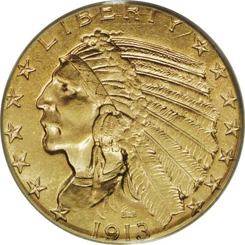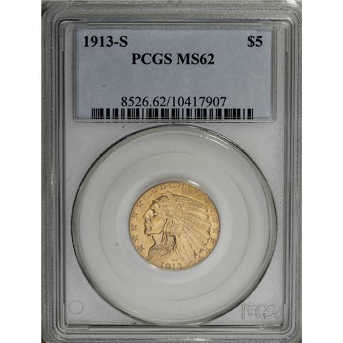 <B>1913-S $5 MS62 PCGS.</B></I> The 1913-S half eagle is frequently found with a poor strike, especially in the peripheral areas. The mintmark is normally quite mushy and lacks any central definition (Jeff Garrett and Ron Guth, 2006). This particular example indeed displays the ill-defined mintmark, that almost resembles an O. The remaining design features are well impressed, however. Both sides exhibit peach-gold patination. Census: 94 in 62, 30 finer (12/06).<BR><BR><b>Shipping:</b> Coin/Currency (<a target="_blank" href="http://www.heritageauctions.com/common/shipping.php">view shipping information</a>)