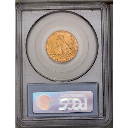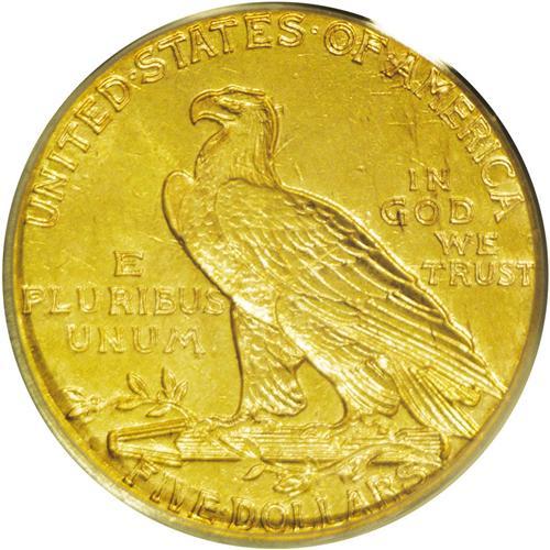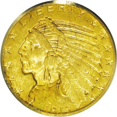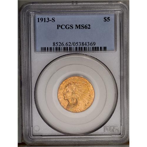 <B>1913-S<$5> MS62 PCGS.</B></I> This example appears to be typical of many with an average strike and a weak mintmark. Peripheral die deterioration has created some weakness near the borders. Both sides have medium yellow-gold color with hints of pink toning.