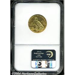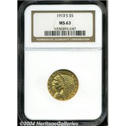 <B>1913-S<$5> MS63 NGC.</B></I> The 1913-S is one of the stoppers in the set of S-mint Indian half eagles in mint condition, especially in MS63 and better grades. This is an especially attractive example that displays rich mint frost over each side and strong striking details throughout, except of course, on the lowest feather of the headdress. A magnifier reveals a couple of small abrasions on the lower portion of the Indian's face; otherwise, the surfaces are minimally abraded with a light accent of peripheral golden-brown coloration. Population: 26 in 63, 6 finer (6/04).<BR><I>From The Sarasota Collection.</B></I> <BR><BR><B>Important notice:</B> Heritage usually auctions material at the rate of 200-250 lots per hour. On some occasions eBay Live bid software or the Internet may not be able to keep up with the pace of the auction. We recommend placing a realistic absentee bid now as insurance to avoid disappointment. Occasionally the auctioneer may eliminate or reject an eBay Live bid, and the auctioneer may also reopen a lot after the close of the eBay live bidding (usually because we missed an audience bid), and may reject your bid even if it shows you as the winning bidder. By bidding via eBay Live, you agree that Heritage may award the lot to another bidder at its sole discretion under the circumstances described above or any other reasonable circumstances. Since eBay bids are not shown to us until we open the lot on the floor, we treat those bids just like floor bids. In most cases the floor responds before the eBay bid is presented to us, due to Internet lag time, so for consistency we have made it a policy that floor bids are always considered first over tie eBay live bids. Also please note that all Heritage lots purchased through eBay Live carry a 20% Buyer's Premium. Please make sure you read the Terms and Conditions before you bid. </span></font></tr></table></td></tr></table>