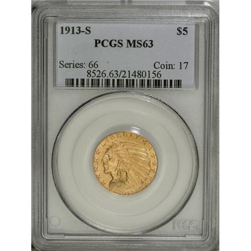 <B>1913-S $5 MS63 PCGS.</B></I> A Select and sharply struck piece that seems to tell the tale of two coins. The obverse is wheat-gold, while the reverse is deep orange and sports soft, satiny luster. Each side has light marks that partly define the grade. Population: 31 in 63, 16 finer (10/06).<BR><I>From The Dr. Eugene Cherny Collection of $5 and $10 Indians.</B></I><BR><BR><b>Shipping:</b> Coin/Currency (<a target="_blank" href="http://www.heritageauctions.com/common/shipping.php">view shipping information</a>) <BR><BR><B>Importan