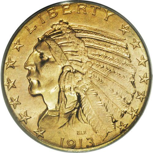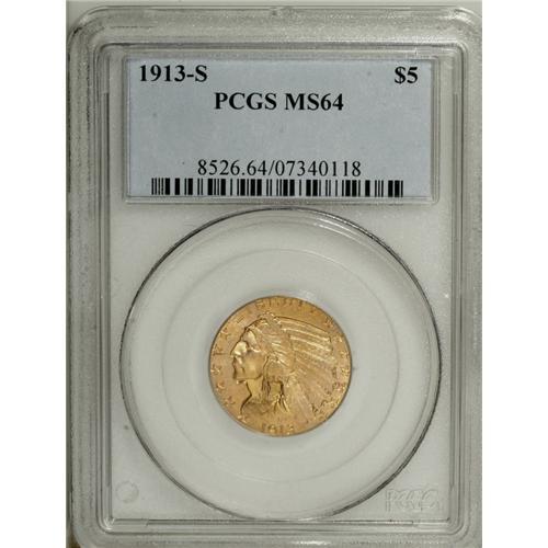 <B>1913-S $5 MS64 PCGS.</B></I> The 1913-S follows the pattern of several S-mint Indian half eagles, being relatively available in the circulated and lower Mint State grades, but legitimately scarce once the Choice level is reached. Offered here is splendid near-Gem representative that displays excellent sharpness except for a shallow, shapeless mintmark that is nearly diagnostic for a 1913-S. The luster, however, is especially vibrant and the satin surfaces exude vivid orange-gold patina. Outstanding, virtually unsurpassable quality for this conditionally scarce half eagle. Population: 14 in 64, 2 finer (11/06).<BR><BR><b>Shipping:</b> Coin/Currency (<a target="_blank" href="http://www.heritageauctions.com/common/shipping.php">view shipping information</a>)
