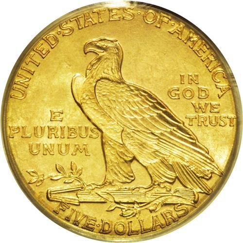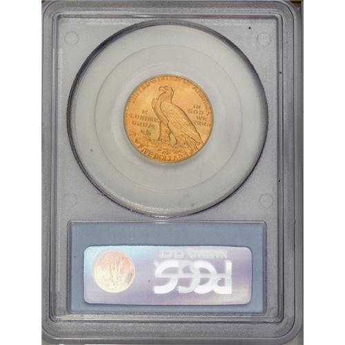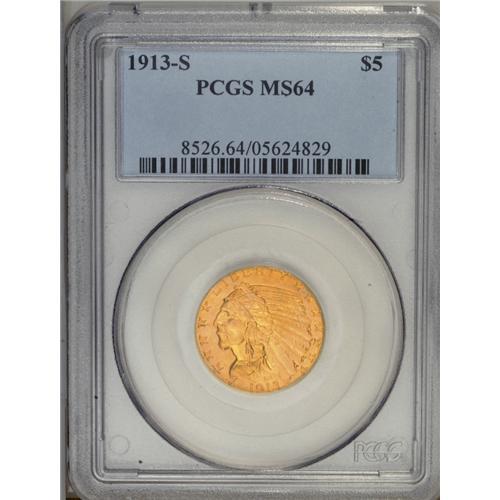 <B>1913-S<$5> MS64 PCGS.</B></I> While the 1913-S half eagle is relatively available in the circulated and lower Mint State grades, it becomes scarce to non-existent above the MS63 tier. This lovely near-Gem specimen exhibits the average strike and shapeless mintmark that characterize the issue. The luster, however, is above par and the satiny surfaces exude vivid orange-gold patina. Only a couple of almost invisible marks in the left obverse field are seen under close examination, these being the primary grade-limiting factors. A wonderful example that readily justifies its near-Gem designation. Population: 14 in 64, 2 finer (7/06).