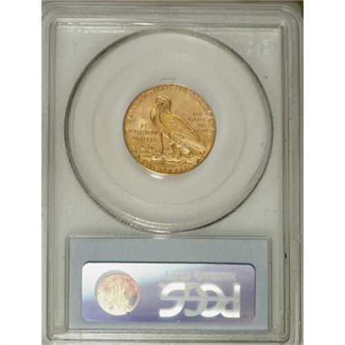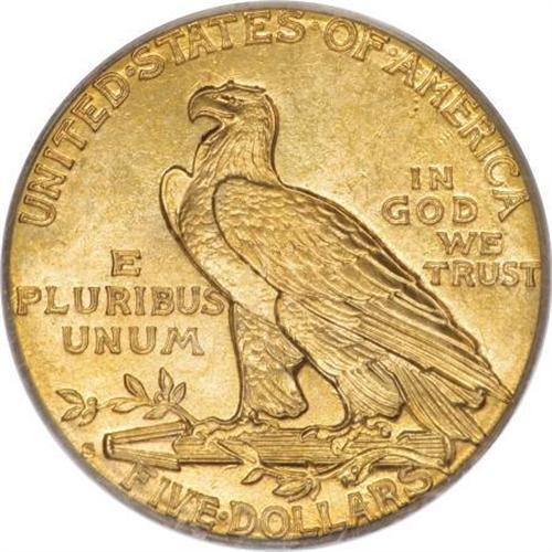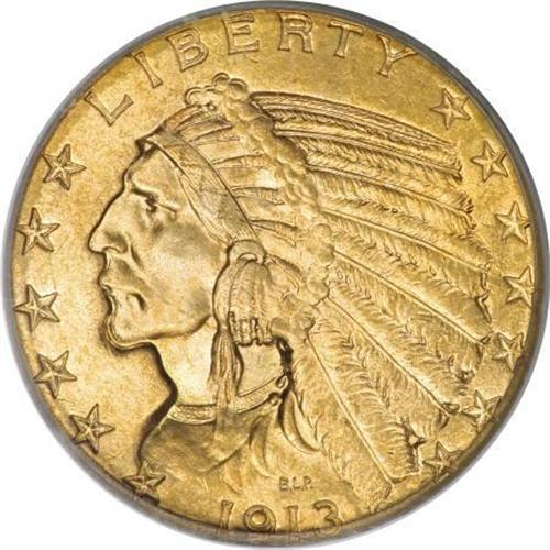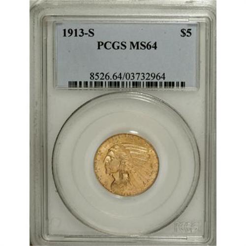 <B>1913-S $5 MS64 PCGS.</B></I> The 1913-S half eagle is one of the scarcest issues in this challenging 20th century gold series. In fact, it is one of the keys in Uncirculated grades. It is especially challenging (unobtainable for most collectors) in MS64 condition. PCGS has only certified 13 other coins in this grade, and only two are finer (11/07). <BR> The present example displays rich reddish-orange surfaces with light lilac patina interspersed on each side. This lilac color is elusive on gold coins and is invariably a sign of uncleaned originality. The surfaces are also notable for their vibrant, frosted mint luster and strong highpoint detail (except on the eagle's left-facing wing, where excess die polish is evident.) Even the usually blunt mintmark displays better-than-average definition. A prized Indian half eagle in near-Gem condition. <BR><BR><B>Coin Engraver:</B> Bela Lyon Pratt<BR><BR><b>Shipping:</b> Coins & Currency (<a target="_blank" href="http://www.heritageauctions.com/common/shipping.php">view shipping information</a>)