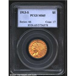 1913-S $5 MS65 PCGS.<p>In terms of overall scarcity, the 1913-S Five Dollar (from a mintage of 408,000 pieces) is not particularly noteworthy in comparison to other Indian Half Eagles, being relatively available in circulated to near Mint State grades. Like other S-mint issues of this type, an immediate decline in availability is noticed at the Uncirculated level and examples grading as high as MS63 can be considered quite scarce. Everything about this amazing Gem defies what is normally expected of a 1913-S Indian. The surfaces are incredibly lustrous and almost completely draped in natural orange patina, lightening to a more delicate golden hue in isolated areas on each side. Not only are the feathers on the headdress and the tips of the eagle's wing sharply detailed, but the often mushy mintmark is also crisply defined. So well produced is this specimen that one has to conjecture if it was some type presentation strike. Regardless of its origin, this exceptional 1913-S Half Eagle has to be counted among the finest known surviving examples. Population: 1 in 65, 1 finer (10/01). Important notice: We expect to be auctioning lots at the rate of 200-250 per hour. Sometimes eBay Premier live bid software cannot keep up with that pace, so we strongly recommend that you place a realistic proxy bid now as insurance to avoid disappointment. Also please note that all Heritage/CAA lots purchased through eBay Premier carry a 20% Buyer's Premium.