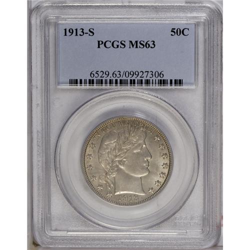 <B>1913-S<50C> MS63 PCGS.</B></I> A bold punch on both sides with immaculate reverse surfaces. The obverse shows several thin, wispy marks across Liberty's face that while not bothersome in the least, account for the grade.