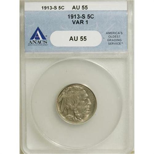 <B>1913-S 5C Type One AU55 ANACS.</B></I> NGC Census: (9/1020). PCGS Population (24/1588). Mintage: 2,105,000. Numismedia Wsl. Price for NGC/PCGS coin in AU55: $75. (#3917)<BR><BR><B>Coin Engraver:</B> James E. Fraser<BR><BR><b>Shipping:</b> Coins & Currency (<a target="_blank" href="http://www.heritageauctions.com/common/shipping.php">view shipping information</a>)