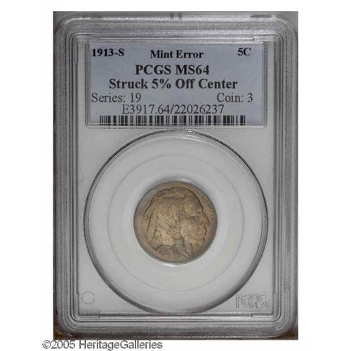1913-S 5C Type One Buffalo Nickel--Struck 5% Off Cente 1913-S[5C] Type One Buffalo Nickel--Struck 5%