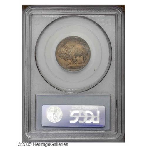 <B>1913-S<5C> Type One Buffalo Nickel--Struck 5% Off Center--MS64 PCGS.</B></I> Richly toned in golden-brown, lilac, and blue-green colors, this unabraded near-Gem is only slightly off center toward 3 o'clock, but has a wide band of unstruck surface centered at 9 o'clock. Intricately struck in the centers, a pinpoint spot atop the bison's front leg is the only relevant imperfection.