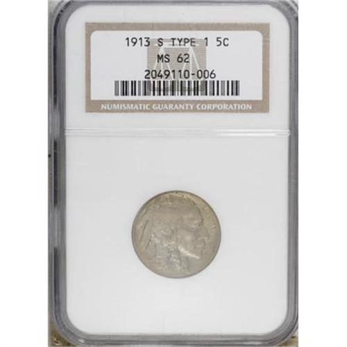 <B>1913-S 5C Type One MS62 NGC.</B></I> NGC Census: (128/817). PCGS Population (71/1356). Mintage: 2,105,000. Numismedia Wsl. Price for NGC/PCGS coin in MS62: $108. (#3917)<BR><BR><B>Coin Engraver:</B> James E. Fraser<BR><BR><b>Shipping:</b> Coins & Currency (<a target="_blank" href="http://www.heritageauctions.com/common/shipping.php">view shipping information</a>)