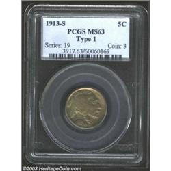 1913-S 5C Type One MS63 PCGS. An important offering for the Mint State Buffalo Nickel date and mint.