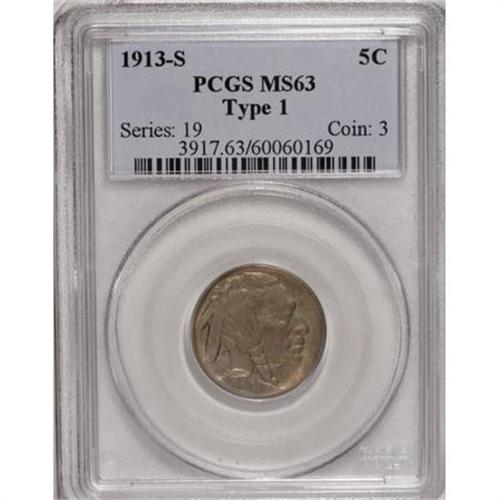 <B>1913-S 5C Type One MS63 PCGS.</B></I> PCGS Population (356/1021). NGC Census: (177/644). Mintage: 2,105,000. Numismedia Wsl. Price for NGC/PCGS coin in MS63: $140. (#3917)<BR><BR><B>Coin Engraver:</B> James E. Fraser<BR><BR><b>Shipping:</b> Coins & Currency (<a target="_blank" href="http://www.heritageauctions.com/common/shipping.php">view shipping information</a>)