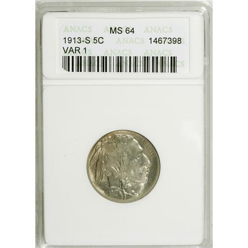 <B>1913-S 5C Type One MS64 ANACS.</B></I> NGC Census: (367/251). PCGS Population (602/373). Mintage: 2,105,000. Numismedia Wsl. Price: $208. (#3917)<BR><BR><b>Shipping:</b> Coins & Currency (<a target="_blank" href="http://www.heritageauctions.com/common/shipping.php">view shipping information</a>)