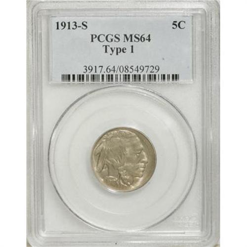 <B>1913-S 5C Type One MS64 PCGS.</B></I> PCGS Population (616/383). NGC Census: (379/250). Mintage: 2,105,000. Numismedia Wsl. Price for NGC/PCGS coin in MS64: $208. (#3917)<BR><BR><B>Coin Engraver:</B> James E. Fraser<BR><BR><b>Shipping:</b> Coins & Currency (<a target="_blank" href="http://www.heritageauctions.com/common/shipping.php">view shipping information</a>)
