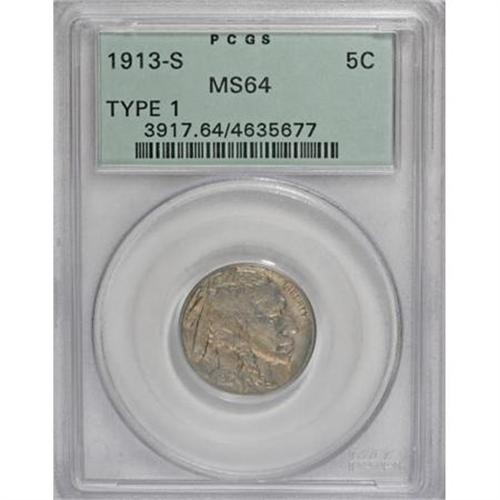 <B>1913-S 5C Type One MS64 PCGS.</B></I> PCGS Population (617/383). NGC Census: (379/250). Mintage: 2,105,000. Numismedia Wsl. Price for NGC/PCGS coin in MS64: $208. (#3917)<BR><BR><B>Coin Engraver:</B> James E. Fraser<BR><BR><b>Shipping:</b> Coins & Currency (<a target="_blank" href="http://www.heritageauctions.com/common/shipping.php">view shipping information</a>)