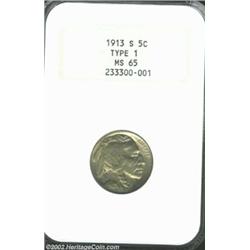 1913-S 5C Type One MS65 NGC. Light, even gray toning covers each side of this fully struck early Buffalo Nickel. By far the scarcest of the Type One issues.From the Col. Carmine Penta Collection. Important notice: We expect to be auctioning lots at the rate of 200-250 per hour. Sometimes eBay Premier live bid software cannot keep up with that pace, so we strongly recommend that you place a realistic proxy bid now as insurance to avoid disappointment. Also please note that all Heritage/CAA lots purchased through eBay Premier carry a 20% Buyer's Premium. Please make sure you read the Terms and Conditions.