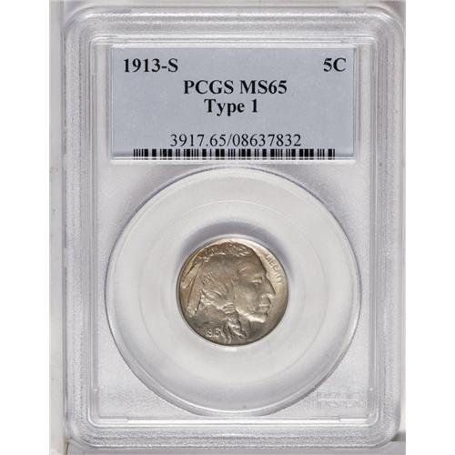 <B>1913-S<5C> Type One MS65 PCGS.</B></I> A nicely struck and charming Gem example with pretty luster. The patina that drapes each side has vivid gold-orange and cool mint-green.