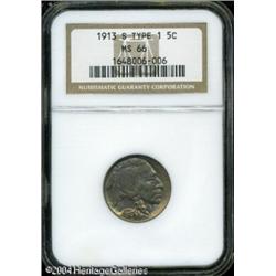 1913-S 5C Type One MS66 NGC. Sharply struck in all <B>1913-S 5C Type One MS66 NGC.</B></I> Sharply struck in all areas with thick mint frost overall, each side is draped in deep shadings of rose and icy blue patina. Population: 38 in 66, 11 finer (11/04). <BR><BR><B>Important notice:</B> Heritage usually auctions material at the rate of 200-250 lots per hour. On some occasions eBay Live bid software or the Internet may not be able to keep up with the pace of the auction. We recommend placing a realistic absentee bid now as insurance to avoid disappointment. Occasionally the auctioneer may eliminate or reject an eBay Live bid, and the auctioneer may also reopen a lot after the close of the eBay live bidding (usually because we missed an audience bid), and may reject your bid even if it shows you as the winning bidder. By bidding via eBay Live, you agree that Heritage may award the lot to another bidder at its sole discretion under the circumstances described above or any other reasonable circumstances. Since eBay bids are not shown to us until we open the lot on the floor, we treat those bids just like floor bids. In most cases the floor responds before the eBay bid is presented to us, due to Internet lag time, so for consistency we have made it a policy that floor bids are always considered first over tie eBay live bids. Also please note that all Heritage lots purchased through eBay Live carry a 20% Buyer's Premium. Please make sure you read the Terms and Conditions before you bid. This lot is being auctioned in conjunction with a live floor auction by Heritage Galleries & Auctioneers. All final auction and invoice information will be supplied by Heritage Galleries & Auctioneers, and all other information should be considered preliminary. Lot:5557