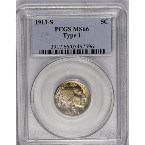 <B>1913-S<5C> Type One MS66 PCGS.</B></I> A glittering testament to Fraser's vision, with vivid orange toning on either side and highly lustrous, well-preserved surfaces. Boldly struck and original.
