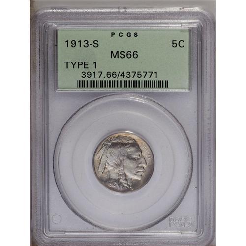 <B>1913-S<5C> Type One MS66 PCGS.</B></I> The rich silver-gray surfaces offer tinges of ice-blue and gold in the protected areas. The surfaces are somewhat pebbly, as made, and the strike is intricately detailed, although soft on LIBERTY and CENTS, as usually seen. Bold evidence of die wear and die clashing is seen on each side. Seldom seen so fine, and certified in a green label holder. PCGS has graded 12 pieces finer (4/06).
