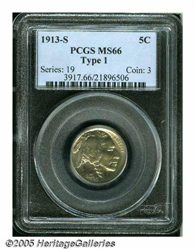 <B>1913-S<5C> Type One MS66 PCGS.</B></I> Well struck, lustrous, and unabraded, with orange-peel textures (as struck) in the fields, and the absence of noteworthy toning on either side of the coin. A great premium Gem. Population: 73 in 66, 12 finer (3/05).