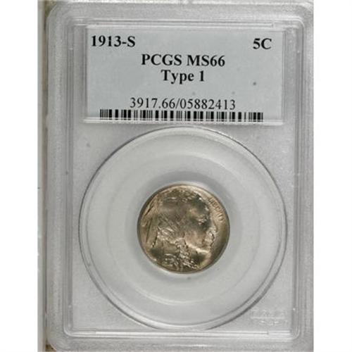 <B>1913-S 5C Type One MS66 PCGS.</B></I> A veneer of champagne-gold color, slightly deeper in hue on the reverse, rests on the lustrous surfaces of this Premium Gem. Nicely preserved, and sharply struck. Population: 94 in 66, 17 finer (12/07).<BR><BR><B>Coin Engraver:</B> James E. Fraser<BR><BR><b>Shipping:</b> Coins & Currency (<a target="_blank" href="http://www.heritageauctions.com/common/shipping.php">view shipping information</a>)