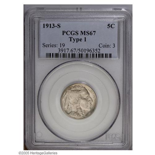 <B>1913-S<5C> Type One MS67 PCGS.</B></I> Bright mint luster glows beneath the silver-green toning that lightly covers each side of this superior coin. Very scarce in the better grades of Mint State, PCGS has only certified 11 pieces in this lofty grade, with 1 finer (10/05). Die clashing shows on the upper right side of the reverse, producing a triangular mark over E PLURIBUS UNUM. Very sharply struck as well, with strong definition in all the vital areas.