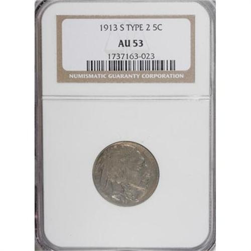 <B>1913-S 5C Type Two AU53 NGC.</B></I> This lightly circulated nickel displays golden-gray patination on bright surfaces, and the design features are nicely defined. We mention a small scrape on the date, and another on the lower large feather.<BR><BR><b>Shipping:</b> Coins & Currency (<a target="_blank" href="http://www.heritageauctions.com/common/shipping.php">view shipping information</a>)