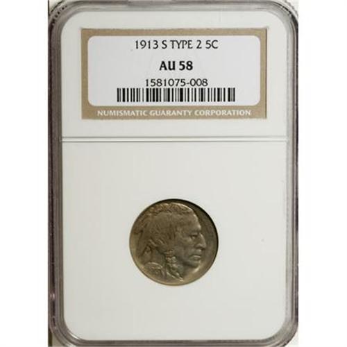 <B>1913-S 5C Type Two AU58 NGC.</B></I> Though a soft strike and eroded dies make this luminous piece appear considerably worn, in reality, only a trace of friction appears on the highpoints. The luminous surfaces have golden toning with distinct rose elements.<BR><BR><B>Coin Engraver:</B> James E. Fraser<BR><BR><b>Shipping:</b> Coins & Currency (<a target="_blank" href="http://www.heritageauctions.com/common/shipping.php">view shipping information</a>)