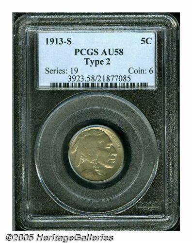 <B>1913-S<5C> Type Two AU58 PCGS.</B></I> Surprisingly lustrous for an AU coin, the surfaces are gray-olive and the striking details are a bit soft. Scarce.