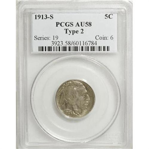 <B>1913-S 5C Type Two AU58 PCGS.</B></I> PCGS Population (202/851). NGC Census: (147/614). Mintage: 1,209,000. Numismedia Wsl. Price for NGC/PCGS coin in AU58: $540. (#3923)<BR><BR><B>Coin Engraver:</B> James E. Fraser<BR><BR><b>Shipping:</b> Coins & Currency (<a target="_blank" href="http://www.heritageauctions.com/common/shipping.php">view shipping information</a>)