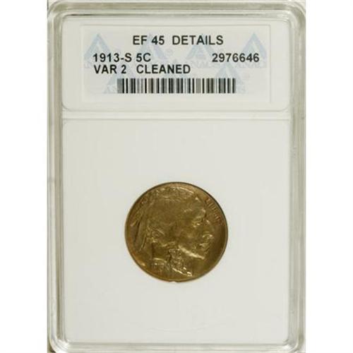 <B>1913-S 5C Type Two--Cleaned--ANACS. XF45 Details.</B></I> NGC Census: (16/788). PCGS Population (35/1143). Mintage: 1,209,000. Numismedia Wsl. Price for NGC/PCGS coin in XF45: $430. (#3923)<BR><BR><b>Shipping:</b> Coins & Currency (<a target="_blank" href="http://www.heritageauctions.com/common/shipping.php">view shipping information</a>)