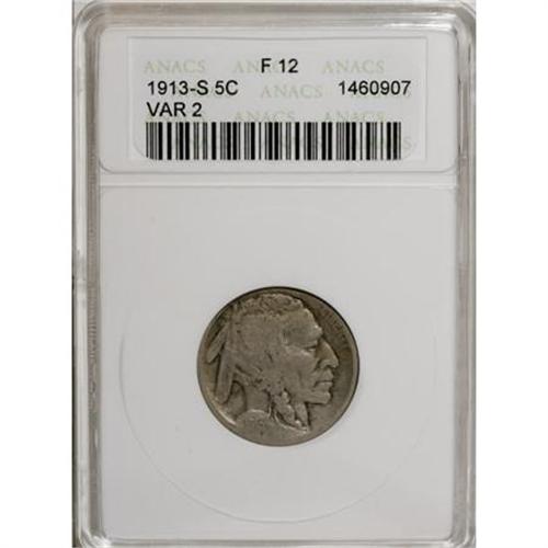 <B>1913-S 5C Type Two F12 ANACS.</B></I> . NGC Census: (8/927). PCGS Population (27/1366). Mintage: 1,209,000. Numismedia Wsl. Price for NGC/PCGS coin in F12: $325. (#3923)<BR><BR><B>Coin Engraver:</B> James E. Fraser<BR><BR><b>Shipping:</b> Coins & Currency (<a target="_blank" href="http://www.heritageauctions.com/common/shipping.php">view shipping information</a>)