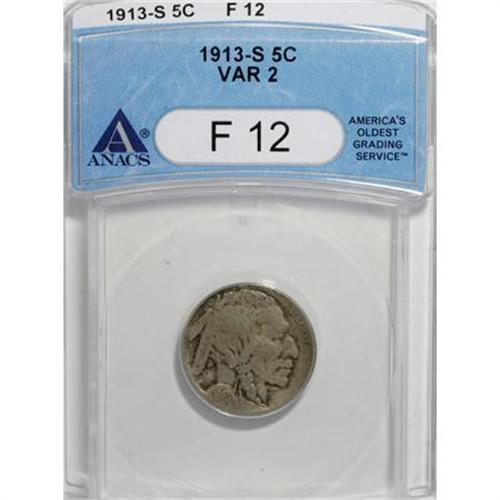 <B>1913-S 5C Type Two Fine 12 ANACS.</B></I> PCGS Population (30/1383). NGC Census: (9/938). Mintage: 1,209,000. Numismedia Wsl. Price for NGC/PCGS coin in F12: $325. (#3923)<BR><BR><B>Coin Engraver:</B> James E. Fraser<BR><BR><b>Shipping:</b> Coins & Currency (<a target="_blank" href="http://www.heritageauctions.com/common/shipping.php">view shipping information</a>)