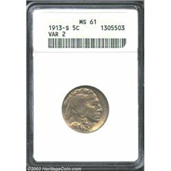 <TABLE cellSpacing=0 cellPadding=0 width="100%" bgColor=#000000 border=0><TBODY><TR><TD width="100%"><TABLE cellSpacing=1 cellPadding=3 width="100%" border=0><TBODY><TR><TD width="100%" bgColor=#79735c><FONT face=arial color=#ffffff size=3><B>Description</B> </FONT></TD></TR><TR><TD width="100%" bgColor=#ffffff><FONT face=arial size=2><B>1913-S 5C Type Two MS61 ANACS.</B></I> A nicely struck representative that has radiant olive-brown and slate-gray colors. The surfaces are nearly undisturbed, and appear to possess the eye appeal of a slightly higher grade. Only the 1926-S has a lower mintage among business strikes. The key to a set of first year Buffalo Nickels. </FONT></TD></TR></TBODY></TABLE></TD></TR></TBODY></TABLE><BR><A name=PricesRealized></A><TABLE cellSpacing=0 cellPadding=0 width="100%" bgColor=#000000 border=0><TBODY><TR><TD width="100%"><TABLE cellSpacing=1 cellPadding=3 width="100%" border=0><TBODY><TR><TD width="100%" bgColor=#79735c><A name=PR><FONT face=arial color=#ffffff size=3><B>Previous Prices from Heritage Auctions</B> </FONT></A></TD></TR><TR><TD bgColor=#f6f6ed><TABLE cellSpacing=0 cellPadding=0 width="100%" border=1><TBODY><TR><TD align=middle width="33%"><B>Date</B></TD><TD align=middle width="33%"><B>Service</B></TD><TD align=middle width="33%"><B>Price</B></TD></TR><TR bgColor=whitesmoke><TD width="33%"><B>07/03/2001</B></TD><TD width="33%">ANACS</TD><TD width="33%">$320.00</TD></TR></TBODY></TABLE></TD></TR><TR><TD bgColor=#ffffff><FONT face=arial size=1 ?>PLEASE NOTE: All prices realized reflect the final hammer price PLUS the buyer's premium in auctions that charge a buyer's premium. Each item has a notation at the top of the listing indicating whether that lot included a buyer's premium. Example: A item that sells with a final hammer price of $100 and a 20% buyer's premium will display with a price realized of $120. All information listed is intended to be as accurate as possible, but errors are possible. Please use this guide carefully and inform us of any inaccuracies. </FONT></TD></TR></TBODY></TABLE></TD></TR></TBODY></TABLE><BR><TABLE cellSpacing=0 cellPadding=0 width="100%" bgColor=#000000 border=0><TBODY><TR><TD width="100%"><TABLE cellSpacing=1 cellPadding=3 width="100%" border=0><TBODY><TR><TD width="100%" bgColor=#79735c colSpan=6><FONT face=arial color=#ffffff size=3><B>Price Guide*</B> </FONT></TD></TR><TR bgColor=#f6f6ed><TD align=middle><B>Grade</B> </TD><TD align=middle><B>Coin World<BR>(Trends)</B> </TD><TD align=middle><B>Numismedia<BR>Retail</B> </TD><TD align=middle><B>Numismedia<BR>Wholesale</B> </TD><TD align=middle><B>Coin<BR>Universe</B> </TD><TD align=middle><B>Heritage<BR>Value Index</B> </TD></TR><TR bgColor=#ffffff><TD align=middle>60</TD><TD align=right>$375.00</TD><TD align=right>$380.00</TD><TD align=right>$317.00</TD><TD align=right>$375.00</TD><TD align=right>$272.50</TD></TR><TR style="FONT-WEIGHT: bold" bgColor=#cccfdd><TD align=middle>61</TD><TD align=right>---</TD><TD align=right>$440.00</TD><TD align=right>$367.00</TD><TD align=right>---</TD><TD align=right>$317.17</TD></TR><TR bgColor=#ffffff><TD align=middle>62</TD><TD align=right>$425.00</TD><TD align=right>$510.00</TD><TD align=right>$425.00</TD><TD align=right>---</TD><TD align=right>$364.96</TD></TR><TR bgColor=#ffffff><TD colSpan=6><FONT size=1>*All information listed is intended to be as accurate as possible, but errors are possible. No item may be returned or refused based on this information which is provided as a service to our customers. You should contact each pricing source directly to determine the accuracy of this information. </FONT></TD></TR></TBODY></TABLE></TD></TR></TBODY></TABLE><BR><TABLE cellSpacing=0 cellPadding=0 width="100%" bgColor=#000000 border=0><TBODY><TR><TD width="100%"><TABLE cellSpacing=1 cellPadding=3 width="100%" border=0><TBODY><TR><TD width="100%" bgColor=#79735c><FONT face=arial color=#ffffff size=3><B>Population Guide</B> </FONT></TD></TR><TR bgColor=#ffffff><TD align=middle><!-- Begin Output of Population Grid--><TABLE cellSpacing=0 cellPadding=0 width="100%" border=0><TBODY><TR><TD vAlign=center><TABLE cellSpacing=0 width="100%" border=1 cellsadding="3"><TBODY><TR><TD vAlign=center><TABLE cellSpacing=0 cellPadding=3 width="100%" border=1><TBODY><TR><TD vAlign=center align=middle bgColor=#f0f1e8 colSpan=2 <CENTER><FONT face=Arial size=2><B>PCGS Pop </B></FONT><CENTER></CENTER></TD><TD vAlign=center align=middle bgColor=#f0f1e8 colSpan=2><CENTER><FONT face=Arial size=2><B>NGC Pop</B></CENTER></FONT></TD></TR><TR><TD vAlign=center><FONT face=Arial size=2>(61)</FONT> </TD><TD vAlign=center align=right><FONT face=Arial size=2>8</FONT> </TD><TD vAlign=center><FONT face=Arial size=2>(61)</FONT> </TD><TD vAlign=center align=right><FONT face=Arial size=2>27</FONT> </TD></TR><TR><TD vAlign=center><FONT face=Arial size=2>(>61)</FONT> </TD><TD vAlign=center align=right><FONT face=Arial size=2>605</FONT> </TD><TD vAlign=center><FONT face=Arial size=2>(>61)</FONT> </TD><TD vAlign=center align=right><FONT face=Arial size=2>395</FONT> </TD></TR></TBODY></TABLE></TD></TR></TBODY></TABLE></TD></TR></TBODY></TABLE><!-- End Output of Population Grid--> Important notice: Heritage usually auctions material at the rate of 200-250 lots per hour. On some occasions eBay Live bid software or the Internet may not be able to keep up with the pace of the auction. We recommend placing a realistic absentee bid now as insurance to avoid disappointment. Occasionally the auctioneer may eliminate or reject an eBay Live bid, and the auctioneer may also reopen a lot after the close of the eBay live bidding (usually because we missed an audience bid), and may reject your bid even if it shows you as the winning bidder. By bidding via eBay Live, you agree that Heritage may award the lot to another bidder at its sole discretion under the circumstances described above or any other reasonable circumstances. Also please note that all Heritage lots purchased through eBa