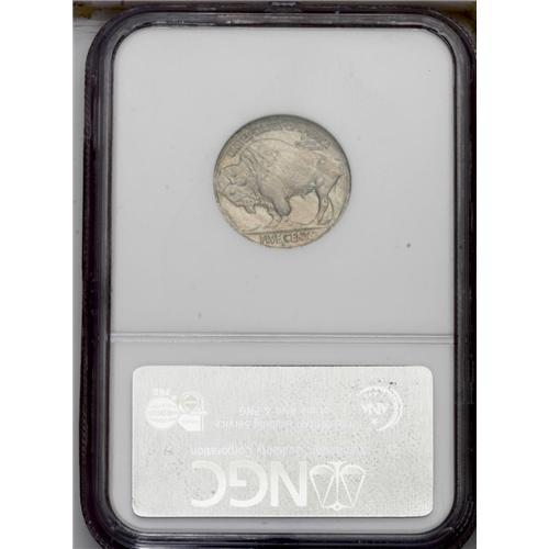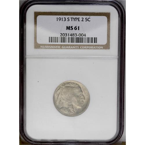 <B>1913-S<5C> Type Two MS61 NGC.</B></I> LIBERTY is faint, even for this issue where it is normally weak. It appears as though the die may have been filling, with grease and/or metal shavings. The first 1 in the date is weak, as are the buffalo's tail and shoulder. However, this silver-gold piece is fairly lustrous and has no carbon spots or mentionable abrasions. Remembering that examples of this semi-key date grading Good 4 are selling for more than 200 dollars and that the multiple for a Mint State specimen is not that high, which would you rather have?