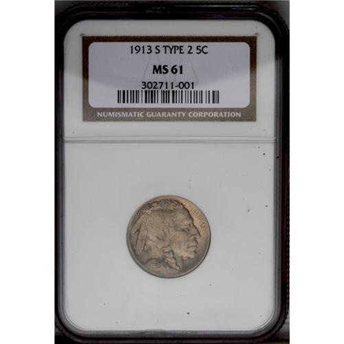 <B>1913-S<5C> Type Two MS61 NGC.</B></I> Rich rose-gray hues consume this satiny and nicely struck semi-key Buffalo nickel. LIBERTY and the tail are softly defined, as often seen for these early branch mint pieces. The obverse has a whisper of verdigris at 8 o'clock. <BR><BR><B>Important notice:</B> Heritage usually auctions material at the rate of 200-250 lots per hour. On some occasions eBay Live bid software or the Internet may not be able to keep up with the pace of the auction. We recommend placing a realistic absentee bid now as insurance to avoid disappointment. Occasionally the auctioneer may eliminate or reject an eBay Live bid, and the auctioneer may also reopen a lot after the close of the eBay live bidding (usually because we missed an audience bid), and may reject your bid even if it shows you as the winning bidder. By bidding via eBay Live, you agree that Heritage may award the lot to another bidder at its sole discretion under the circumstances described above or any other reasonable circumstances. Since eBay bids are not shown to us until we open the lot on the floor, we treat those bids just like floor bids. In most cases the floor responds before the eBay bid is presented to us, due to Internet lag time, so for consistency we have made it a policy that floor bids are always considered first over tie eBay live bids. Also please note that all Heritage lots purchased through eBay Live carry a 20% Buyer's Premium. Please make sure you read the Terms and Conditions before you bid. This lot is being auctioned in conjunction with a live floor auction by Heritage Galleries & Auctioneers. All final auction and invoice information will be supplied by Heritage Galleries & Auctioneers, and all other information should be considered preliminary. Lot:1034 <BR><BR><B>Winning Notification and Billing:</B> After the FINAL session in this auction is complete, Heritage will send e-mail and snail mail invoices. This process normally takes several days. All final auction and invoice information will be supplied by Heritage Galleries & Auctioneers, and all other information should be considered preliminary. <BR><BR>This auction will be conducted on a live auction floor and over the Internet through eBay Live. If you choose to place an absentee bid, please take a moment to <font color='#0000ff'><u><a href='http://pages.ebay.com/liveauctions/help/before/laabsentee.html'>learn how eBay Live absentee bidding works</a></u></font><font color='#000000'>