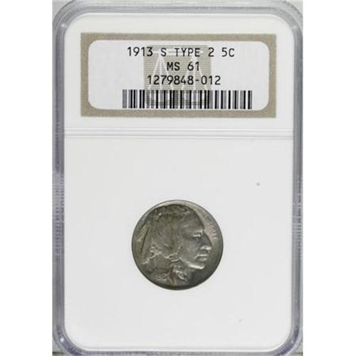 <B>1913-S 5C Type Two MS61 NGC.</B></I> Softly struck with nice satin luster and attractive rose-tan coloration over both sides. Any surface marks are too small to notice without a magnifying glass. One of the key dates in the Buffalo nickel series at all levels of preservation. <BR><BR><b>Shipping:</b> Coins & Currency (<a target="_blank" href="http://www.heritageauctions.com/common/shipping.php">view shipping information</a>)